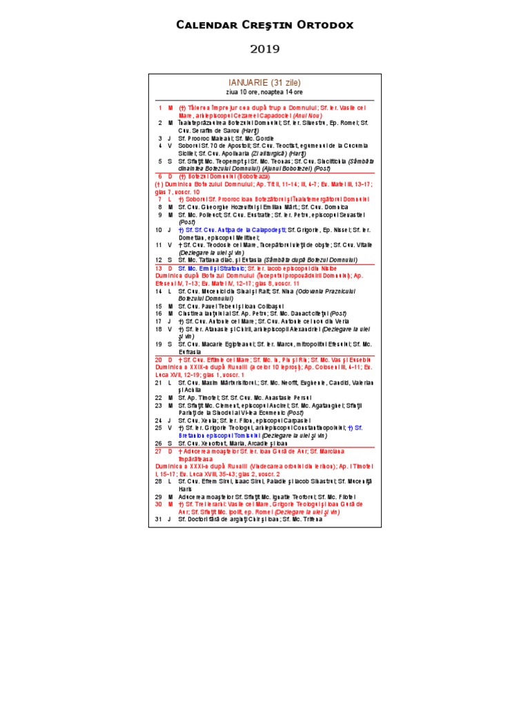 Potrivit calendarului ortodox 2019 , nu se fac nunţi: Descarca documentul 2019 calendar ca html, excel xlsx, word docx, pdf sau imagine. Calendar creștin ortodox » calendar creştin ortodox 2019. Pe măsură ce omul coboară spre smerenie, se înalţă întru duhovnicesc folos. Ianuarie februarie martie aprilie mai iunie iulie august septembrie octombrie noiembrie decembrie.