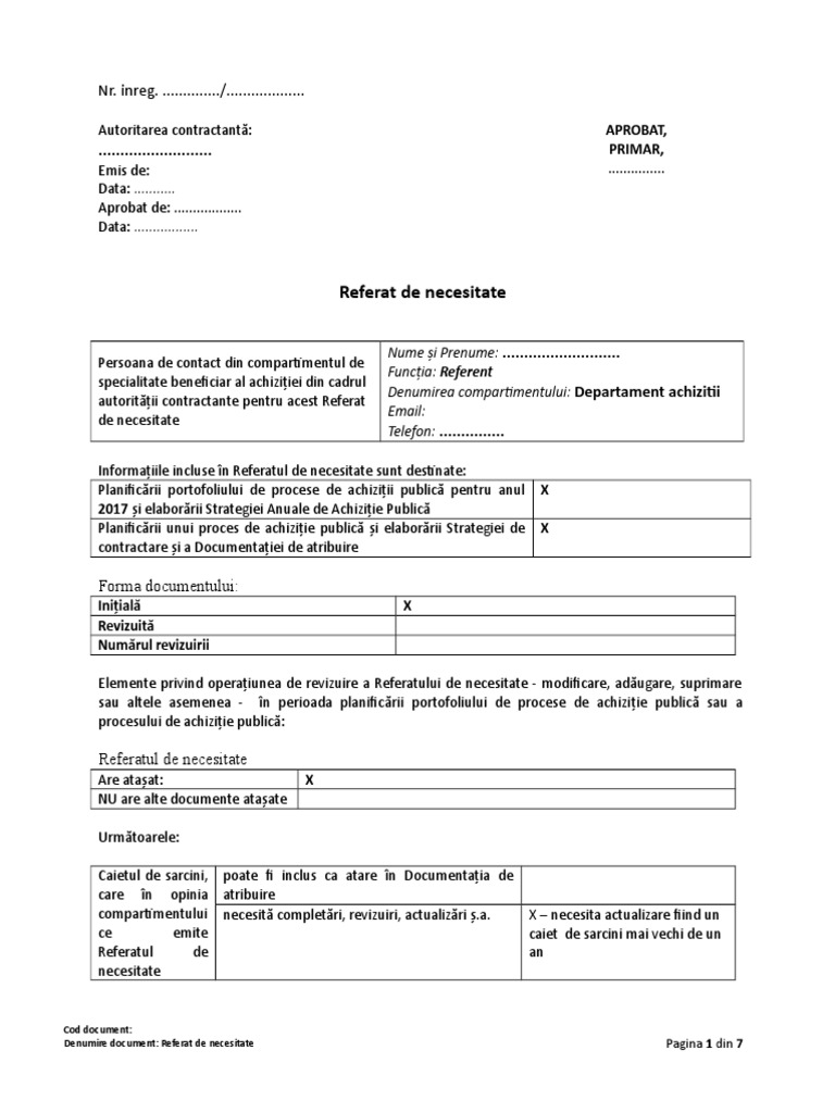 Model referat de necesitate consultanta model referat de necesitate. Referatul de necesitate se completeaza pentru fiecare necesitate identificata la nivel de compartiment de specialitate beneficiar al achizitiei din cadrul autoritatii contractante, respectiv pentru orice achizitie care urmeaza sa fie realizata.